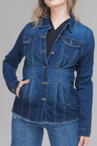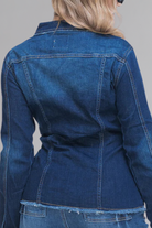 Chaqueta denim azul claro entallada. Diseño con bolsillos frontales, botones metálicos y bajo deshilachado. Estilo moderno y favorecedor para cualquier ocasión.
