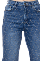 Jeans straight azul con aplicaciones de diamantes. Tiro medio y diseño recto atemporal con un toque glamuroso para looks casuales o de noche.