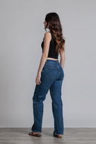 Jeans Marine en mezclilla azul denim, tiro alto con diseño de cinco bolsillos y cierre de botón metálico. Silueta recta y favorecedora.