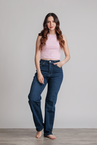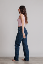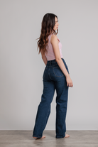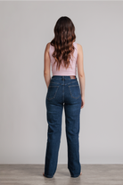 Jeans Marine mezclilla lavado azul oscuro. Tiro alto, silueta recta y ajuste favorecedor. Un básico versátil para looks casuales o elegantes.