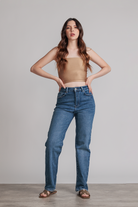 Jeans Marine en mezclilla azul índigo, tiro alto con diseño de cinco bolsillos y cierre de botón metálico. Silueta recta y favorecedora.