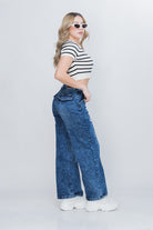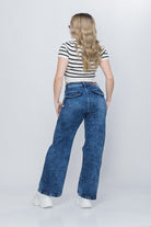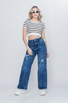 Toque Retro Deezer: Jeans wide leg con talle alto a la cintura, diseño con roturas, trabillas, botón y cremallera,  confeccionados con mezclilla flexible con ajuste cómodo.